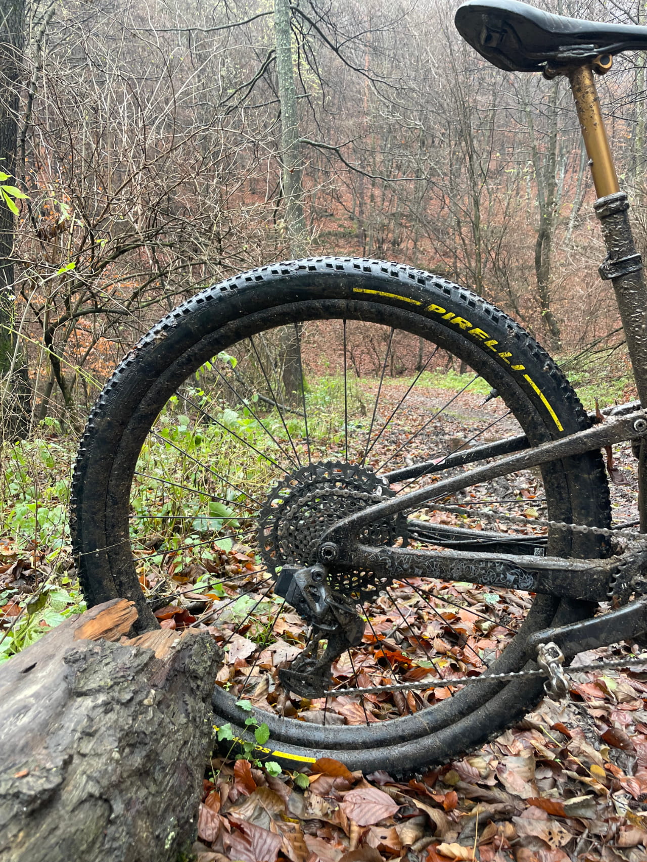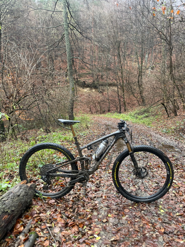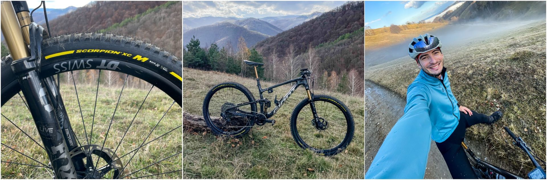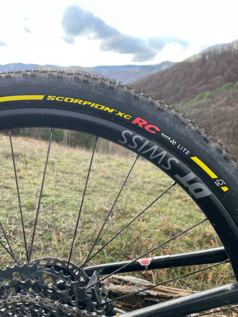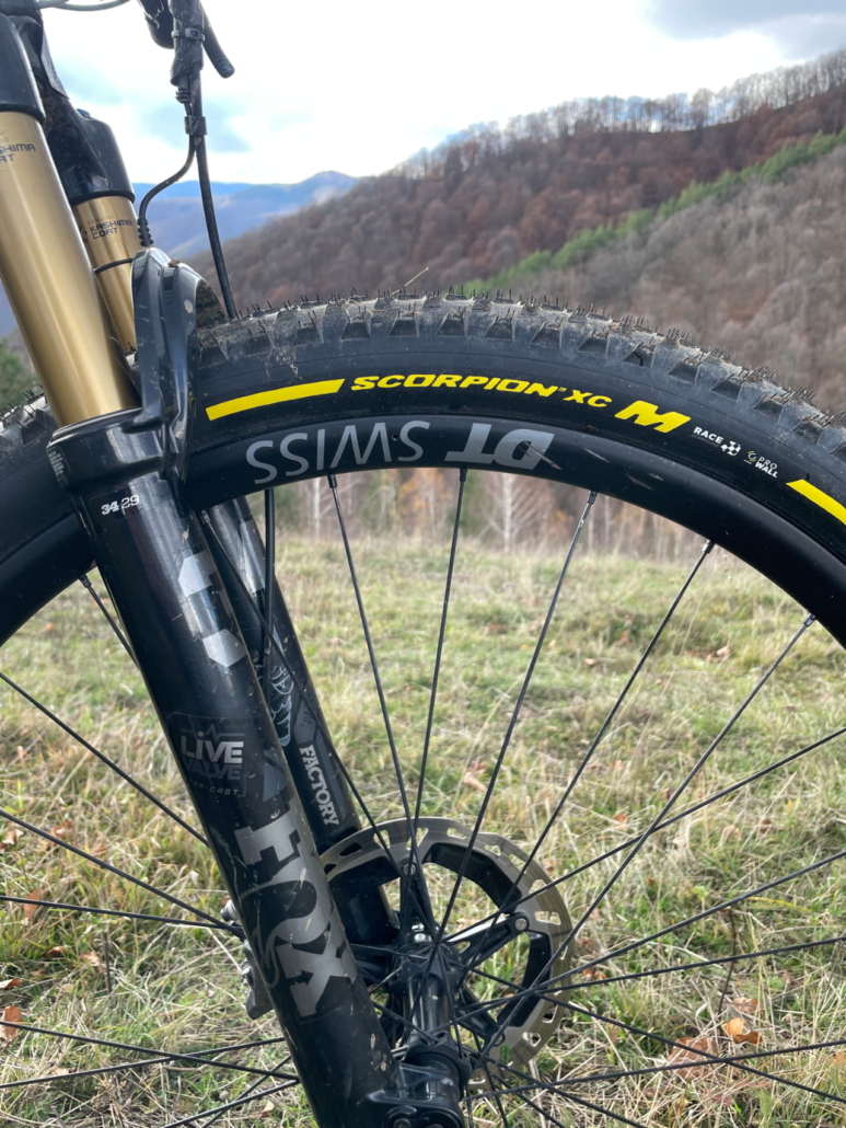 Okay then, it’s time to focus on the Pirelli Scorpion XC M Pro Wall. It’s a tyre tested on the uCI world cup by the Trek and Pirelli team riders, and is generally well respected. It features a more open tread pattern, with aggressive knobs that dig into the trail when you ask it of them, delivering excellent cornering control and stability when required. Technical terrain is what they’re all about, with the Pro Wall casing doing its job and providing a strong sidewall protection against bumps and bushes, making it ideal for lower pressures and rocky and root-filled trails – of which we have plenty here in the forested mountains of Romania and Transylvania.