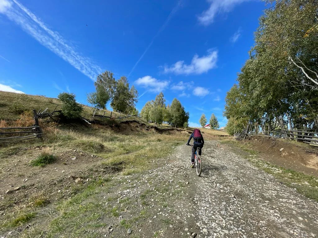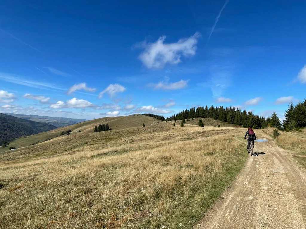 Gradually, the route reaches open ridgelines with sweeping views of the Cindrel, Șureanu, and Făgăraș Mountains — a ride that perfectly blends history, nature, and adventure.